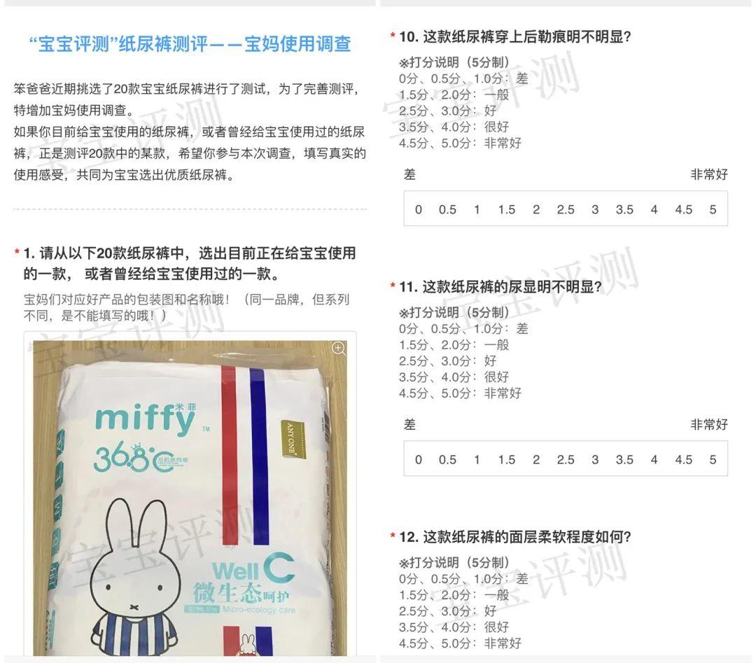 ②第二輪:邀請2094位有過使用經(jīng)歷的寶媽,以問卷的形式對20款紙尿褲進(jìn)行使用體驗評價,評價項目包括: