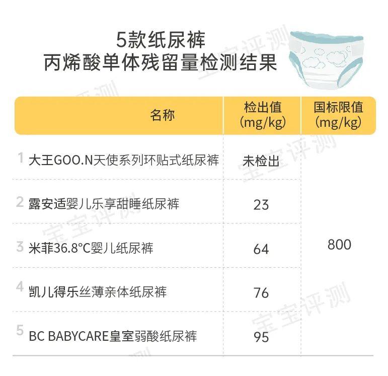 ②5款紙尿褲的丙烯酸單體殘留量均遠(yuǎn)低于國標(biāo)限值。