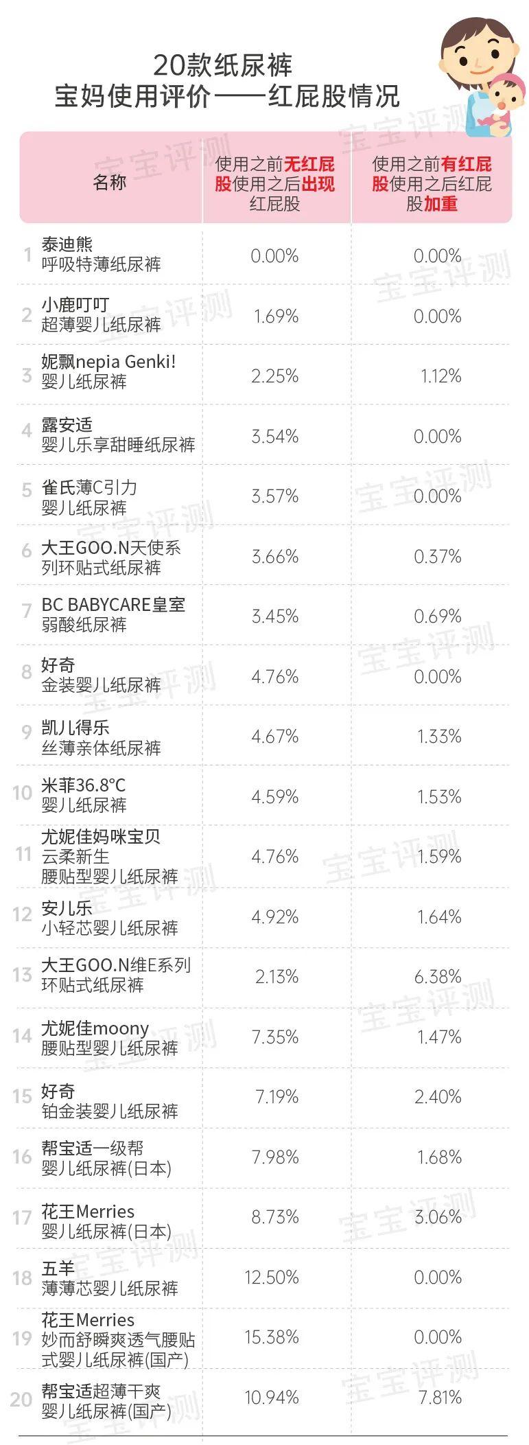 從寶媽們的反饋來看,幫寶適超薄干爽、花王Merries妙而舒、五羊薄薄芯,出現(xiàn)紅屁股或紅屁股加重的情況較多。