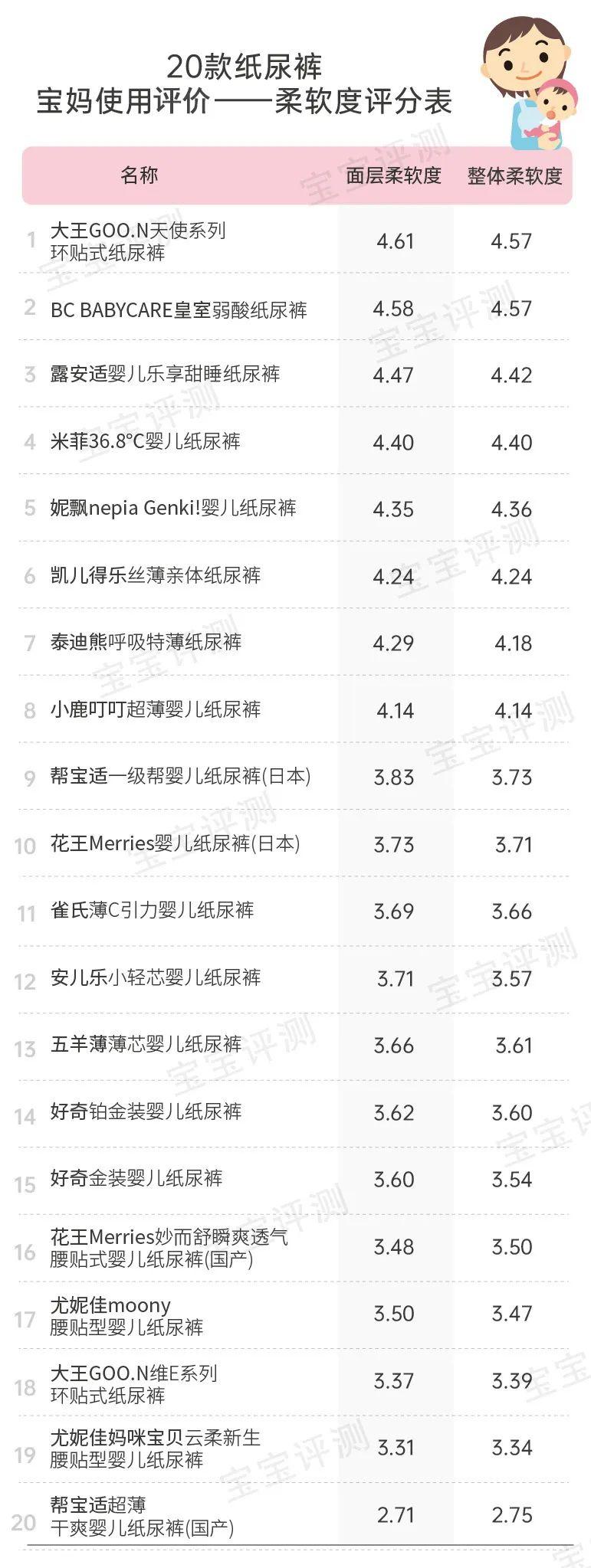 紙尿褲柔軟度包括面層柔軟度和整體柔軟度兩方面,綜合寶媽評價,大王GOO.N天使、BC BABYCARE皇室、露安適樂享甜睡、米菲36.8℃,柔軟度表現(xiàn)較佳。