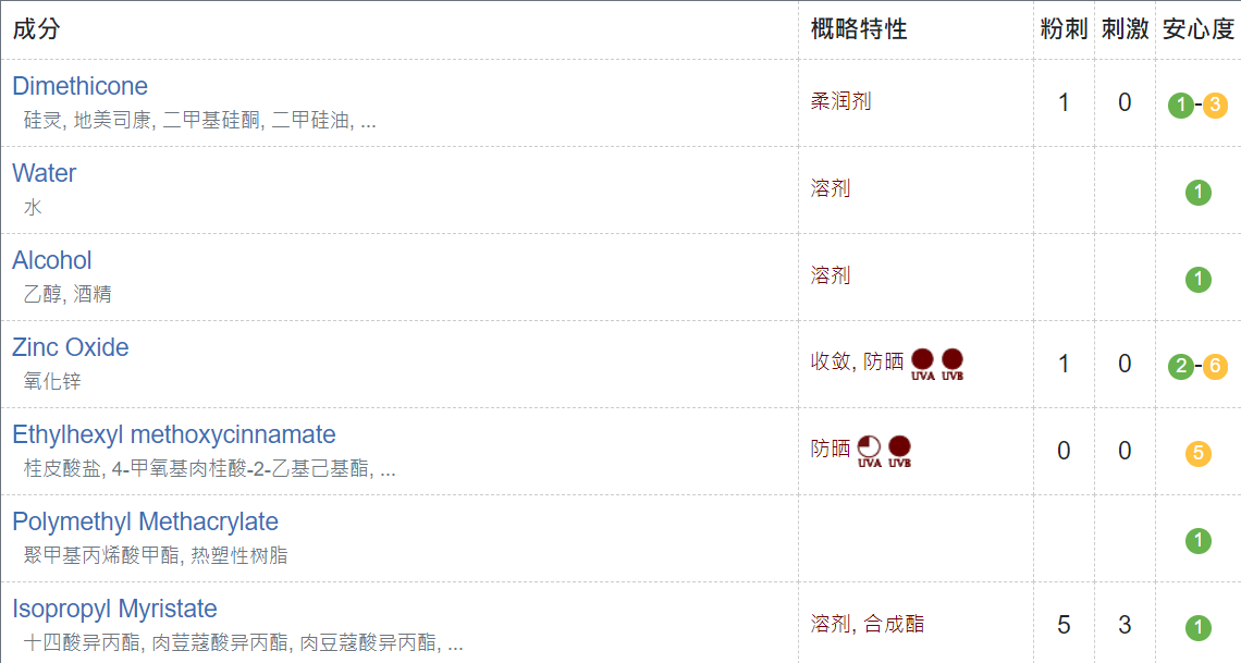 成分含有酒精,主要防曬成分為氧化鋅、桂皮鹽酸等。對酒精過敏的人群需要慎用。