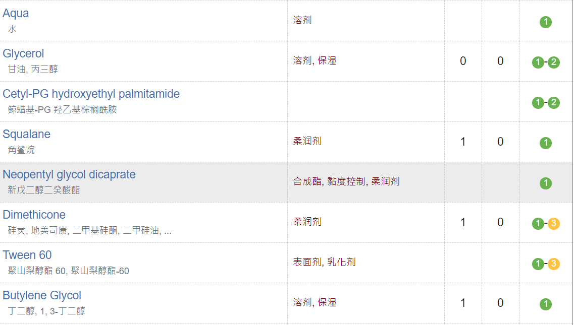 除了一種羥苯丙酯防腐劑存在風(fēng)險,其主要成分都是的,評級很高。其中植物提取成分甘草酸二甲、川谷籽提取物等成分舒緩抗敏、美白果不錯。