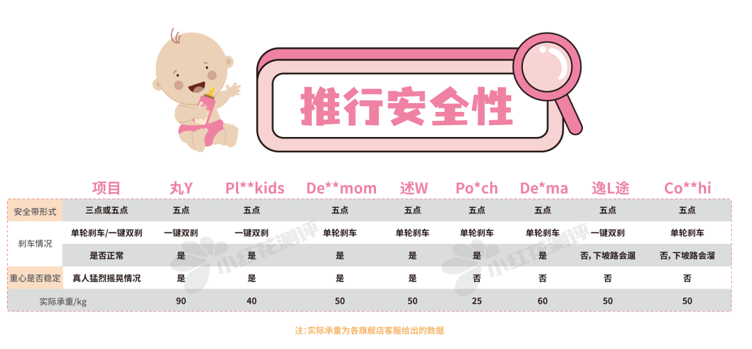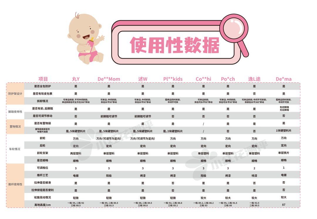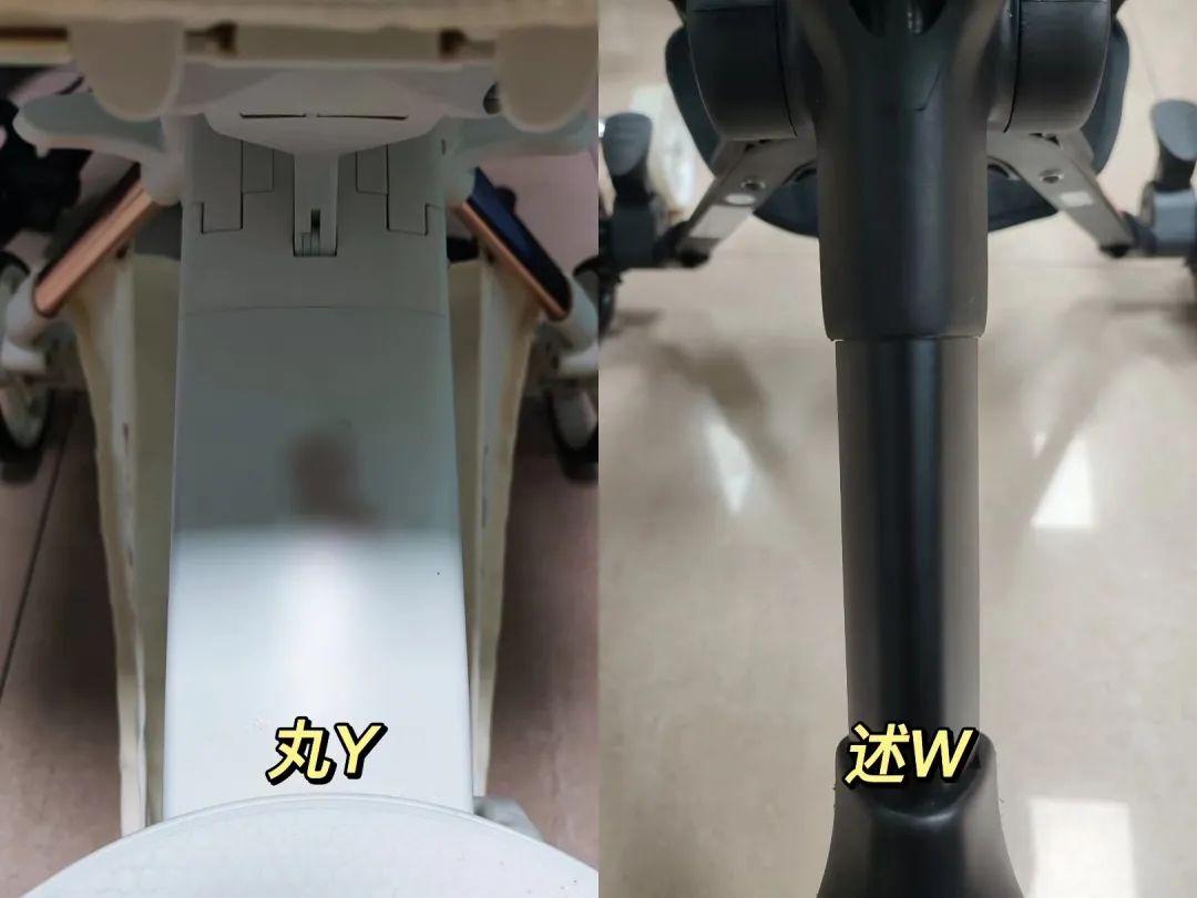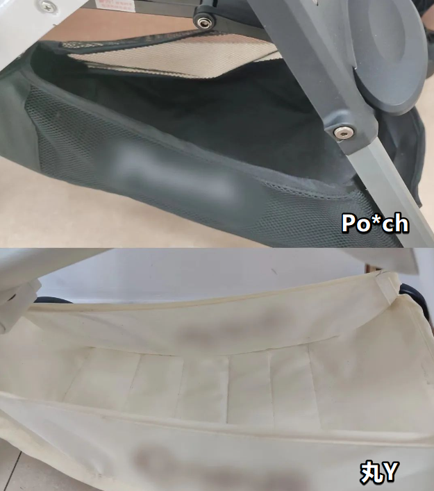 而且丸Y的底部車(chē)架粗壯,顯得更穩(wěn)固;Pl**kids、Po*ch的中等,而De**Mom、述W、De**ma、Co**hi的車(chē)架則較細(xì)。