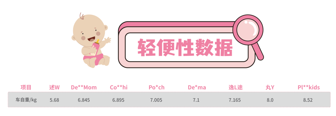 Pl**kids重,Co**hi、De**Mom、述W的車(chē)自重都小于7kg,述W輕,只有5.68kg。