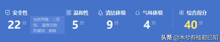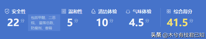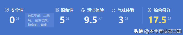 妙思樂(lè)在甲醛、二噁烷、防腐劑、菌落總數(shù)4項(xiàng)專(zhuān)業(yè)性評(píng)測(cè)中,檢出少量甲醛,但含量在國(guó)標(biāo)要求范圍內(nèi)。在體驗(yàn)式評(píng)測(cè)中,pH值稍低,更適合大齡寶寶使用;清潔效果較弱,但是用后肌膚滋潤(rùn)不干燥;香味自然不刺鼻。
