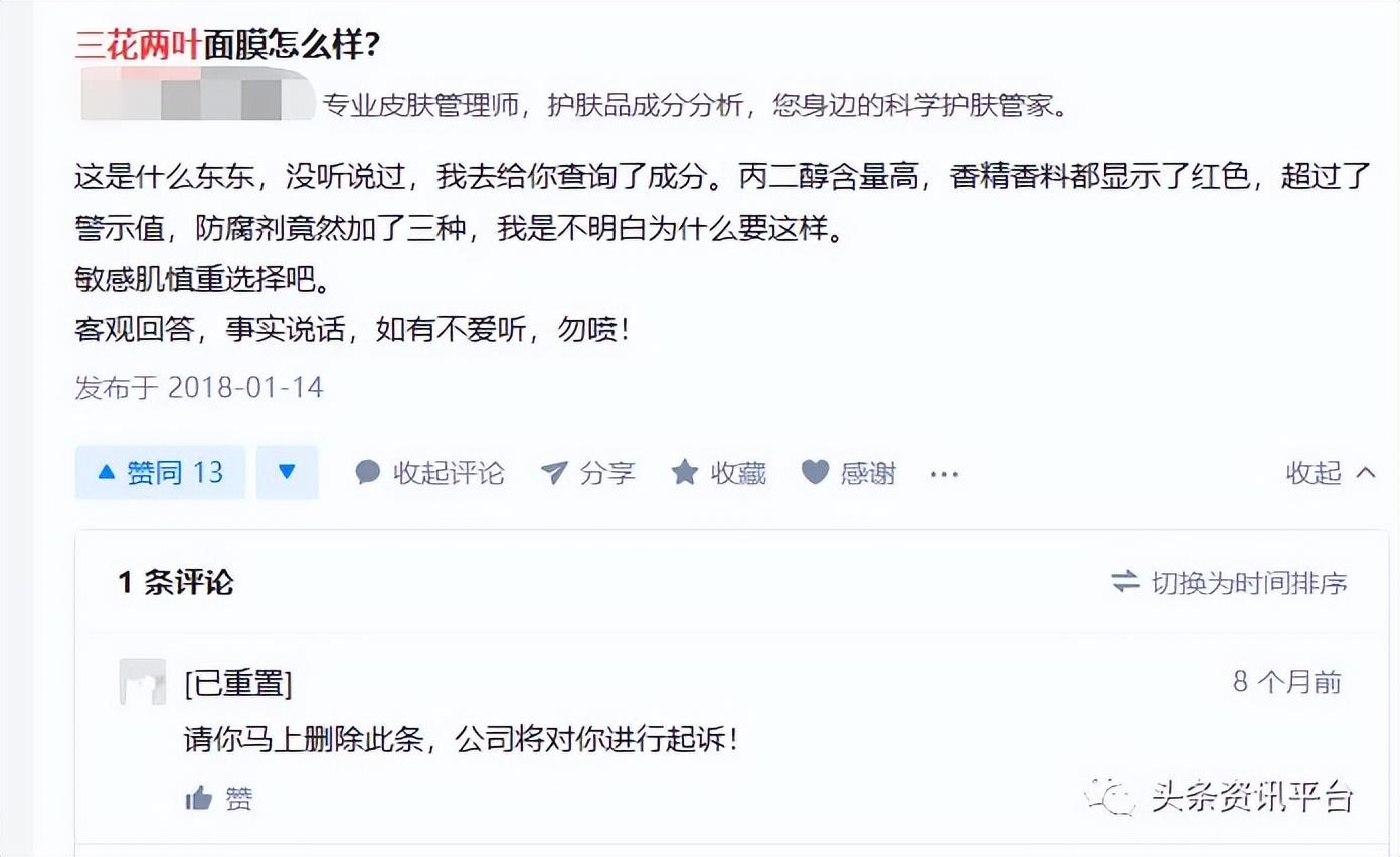 事實(shí)上,除了仟花佰草、三花兩葉與簡啦啦外,在這段時(shí)間內(nèi),還有一個(gè)名為“花肌源”的微商品牌也同樣代理過相關(guān)面膜產(chǎn)品,價(jià)格同樣是99元三盒,而花肌源官博的認(rèn)證公司也是廣州花肌粹化妝品有限公司。那么,官博認(rèn)證公司是廣州花肌粹化妝品有限公司的品牌還有沒有了? 答案是有的,調(diào)查發(fā)現(xiàn):美肌顏,歐逸姿俏熙,膜小妹,花印良品,古茜,淺色,時(shí)尚指尖,花色印記,妝印等品牌都是已知隸屬于花肌粹公司旗下的…… 我們?cè)谏衔奶岬搅?,美肌顏的三款產(chǎn)品就曾檢出標(biāo)簽未標(biāo)識(shí)的防腐劑“苯氧乙醇和4-羥基苯甲酸甲酯”,那么時(shí)以至今,該公司旗下的其他產(chǎn)品到底有沒有在相關(guān)方面做過整改呢? 關(guān)于三花兩葉的面膜,在知乎上有網(wǎng)友表示“丙二醇含量高,香精香料都顯示了紅色,超過了警示值,防腐劑竟然加了三種,我是不明白為什么要這樣,敏感肌慎重選擇吧?!比缓螅辛硪晃痪W(wǎng)友回復(fù)稱“請(qǐng)你馬上刪除此條,公司將對(duì)你進(jìn)行起訴!”、“我是三花兩葉官方運(yùn)營商,希望你們不要傳播一些詆毀我們品牌的謠言,否則公司將對(duì)你們進(jìn)行起訴!”