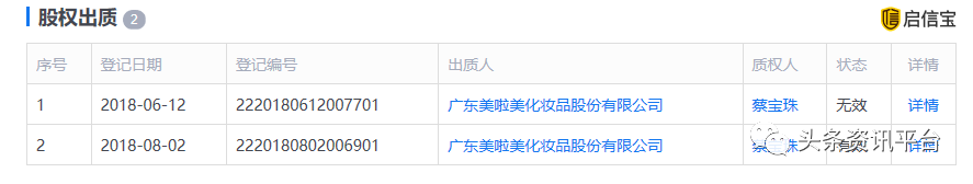 而據(jù)啟信寶顯示,真正意義上與該公司擁有出資關(guān)系的子公司僅有廣州力雅化妝品有限公司一家(其他公司大多是由武京磊和陳娟自然人投資,企業(yè)法人并非“美啦美”)。經(jīng)查,該公司成立于2009年7月3日,法定代表人黃雪文,注冊(cè)資本1000萬元,實(shí)繳3萬元,股東有黃雪文、蔡寶珠和美啦美公司(2018年5月30日新增)。 據(jù)啟信寶顯示,目前,蔡寶珠的股權(quán)數(shù)額200萬和黃雪文的股權(quán)數(shù)額372萬都處于股權(quán)凍結(jié)的狀態(tài)。
