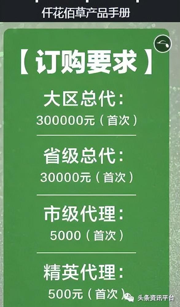 據(jù)悉,仟花佰草品牌的產(chǎn)品零售75元,一般賣會(huì)員價(jià)99元三盒,500元是精英代理,5000元是市級(jí)代理,3萬元是省級(jí)代理,30萬元是大區(qū)總代。