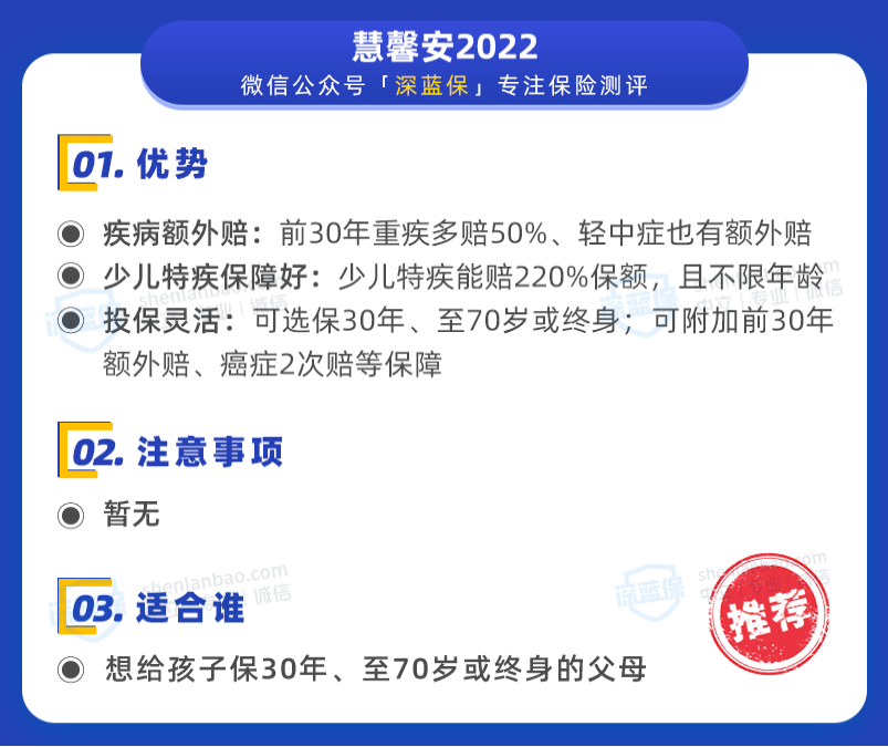 新增:青云衛(wèi)2號(hào)、小淘氣1號(hào)減少:大黃蜂7號(hào)(全能版)原因:「青云衛(wèi)2號(hào)」重新上線;「小淘氣1號(hào)」保終身時(shí)性價(jià)比很不錯(cuò),可附加前30年額外賠,價(jià)格比「大黃蜂7號(hào)(全能版)」便宜慧馨安2022我們前面講過,這款產(chǎn)品保至70歲或終身,性價(jià)比依然很高。如果要買這款產(chǎn)品,建議大家把“前30年額外賠”給加上,這樣重疾、輕中癥都有額外賠。