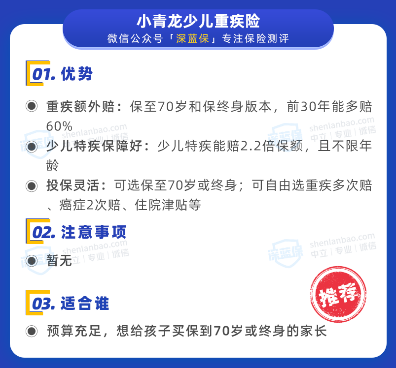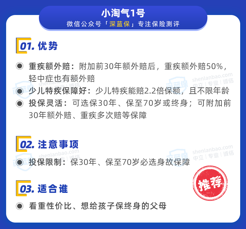 小淘氣1號(hào)能附加“前30年額外賠”,附加后重疾能額外賠60%,輕中癥也有額外賠,價(jià)格不貴,建議大家選上。
