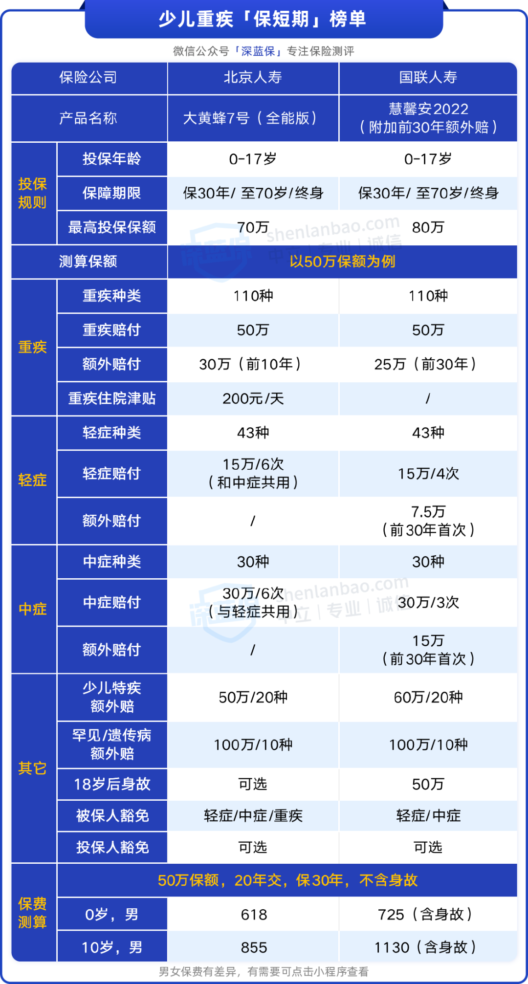 我們挑選出了兩款適合保短期的少兒重疾險(xiǎn),具體如下表: