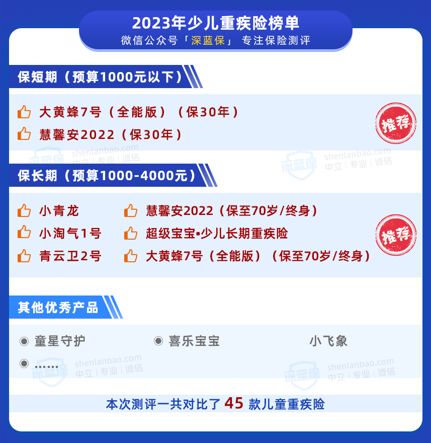 為了幫助大家挑選到高性價(jià)比的產(chǎn)品,我們仔細(xì)對(duì)比了45款少兒重疾險(xiǎn),得出了少兒重疾險(xiǎn)榜單,共分為兩部分: