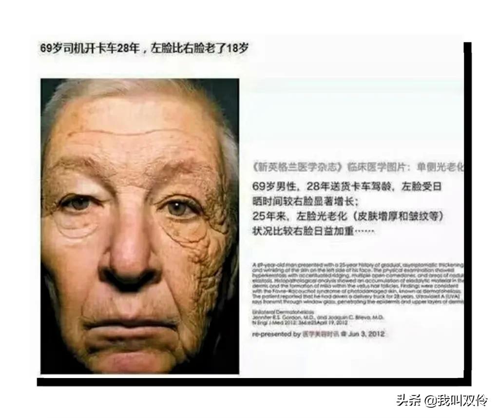 69歲司機(jī)開(kāi)卡車(chē)28年,左臉受日曬時(shí)間比右臉長(zhǎng),左臉比右臉皮膚更衰老。左臉看起來(lái)比右臉老了18歲。