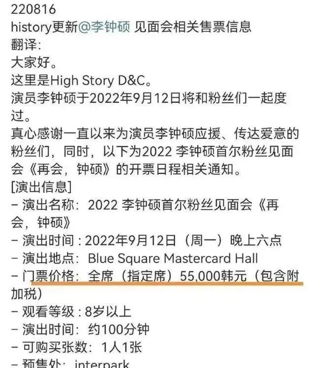 在韓國,李鐘碩開粉絲見面會入場費僅需55000韓元。