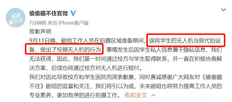 今年,《偷偷藏不住》劇組因為在學校砸了學生的無人機被曝光。
