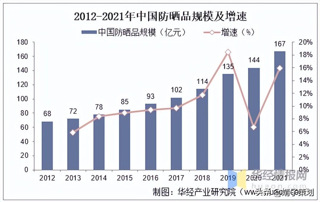數(shù)據(jù)顯示,2012-2021年中國防曬品市場規(guī)模呈現(xiàn)逐年上漲趨勢,10年間CAGR為10.5%,2021年市場規(guī)模達(dá)167億元。中國防曬品規(guī)模增速遠(yuǎn)超,防曬品需求景氣度較高。