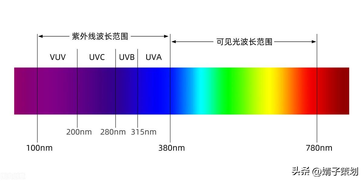紫外線是一段連續(xù)的光譜:一般包含VUV、UVC、UVB、UVA;電磁波短的波長100nm~380nm的光叫做紫外線(此段也為不可見光的一部分);可見光是有一定的波長范圍的,波長從400納米到700納米的光成為可見光,波長在這個(gè)范圍之外的光就是不可見光了,(小于400為紫外線,大于700為紅外線),光的波長越長顏色就越偏紅色,波長超出了可見光波長上限的光就是紅外線,波長越短顏色就越偏向紫色,波長小于可見光波長范圍的下限就是紫外線了。波長越短能量越強(qiáng)!