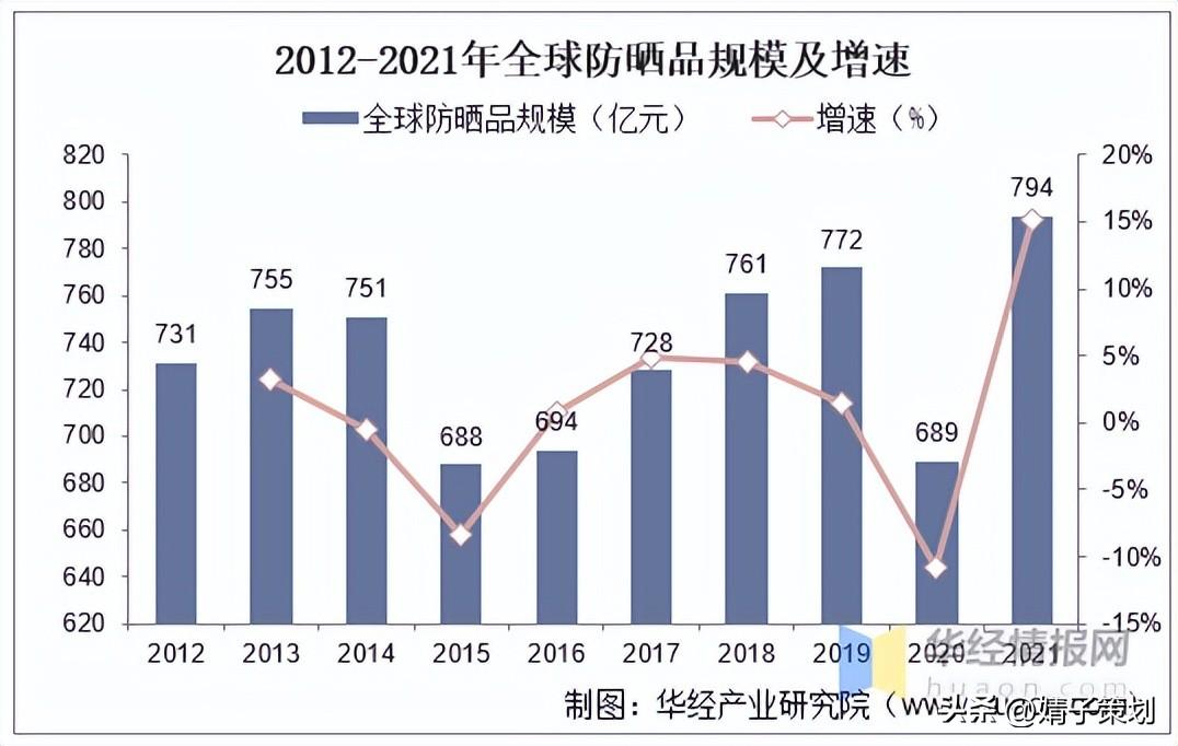 2012-2021年防曬品規(guī)模及增速