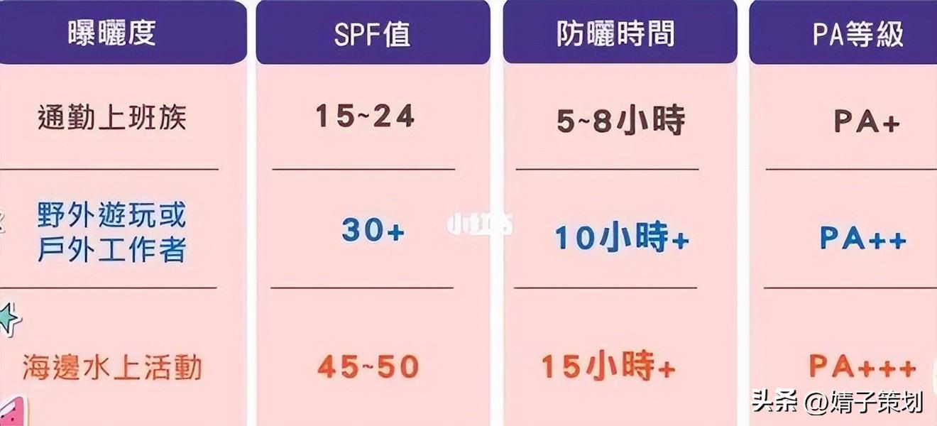 針對一般環(huán)境選擇防曬產(chǎn)品的建議SPF值與PA等級(jí):