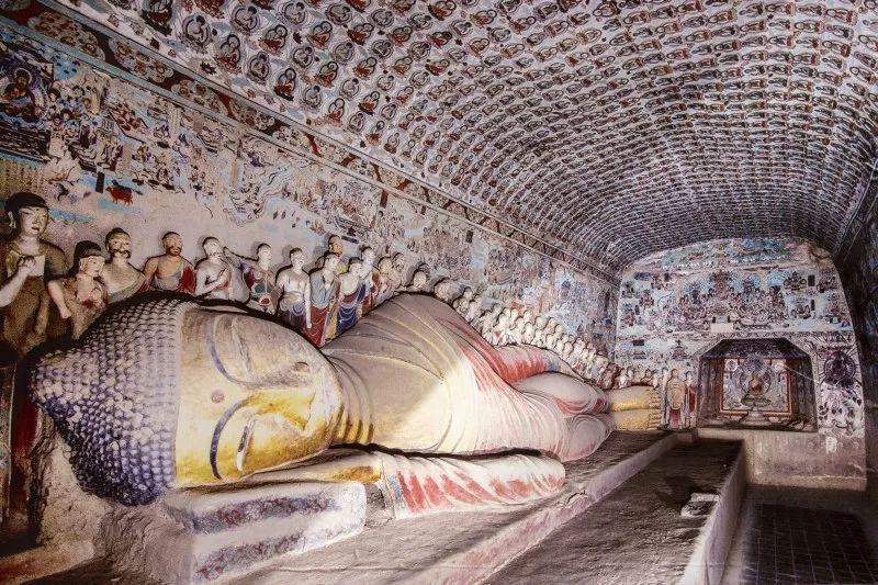 約半數(shù)的石窟開鑿于唐朝,莫高窟也匯集了大唐帝國美術(shù)之精粹。仿佛能隨呼吸而起伏的溫柔菩薩雕塑、經(jīng)變壁畫上吳帶當(dāng)風(fēng)的歌姬……縱使剎那已千年,大唐盛景似乎仍停滯在黑暗的石窟中,開門的同時,仿佛開闔了時空的通道。