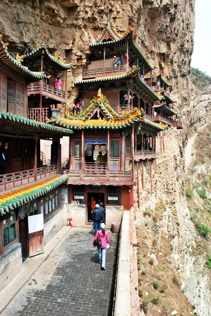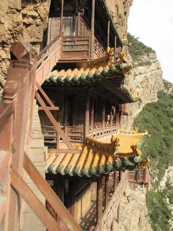 懸空寺的主體是兩座三檐歇山頂?shù)闹鞯?,兩殿之間用懸梯連接,大的三官殿寬6米,深4米,小的真武殿不足1米,二層和三層之間的棧道幾乎全部懸空,走這一段即便不恐高也難免兩腿發(fā)軟。