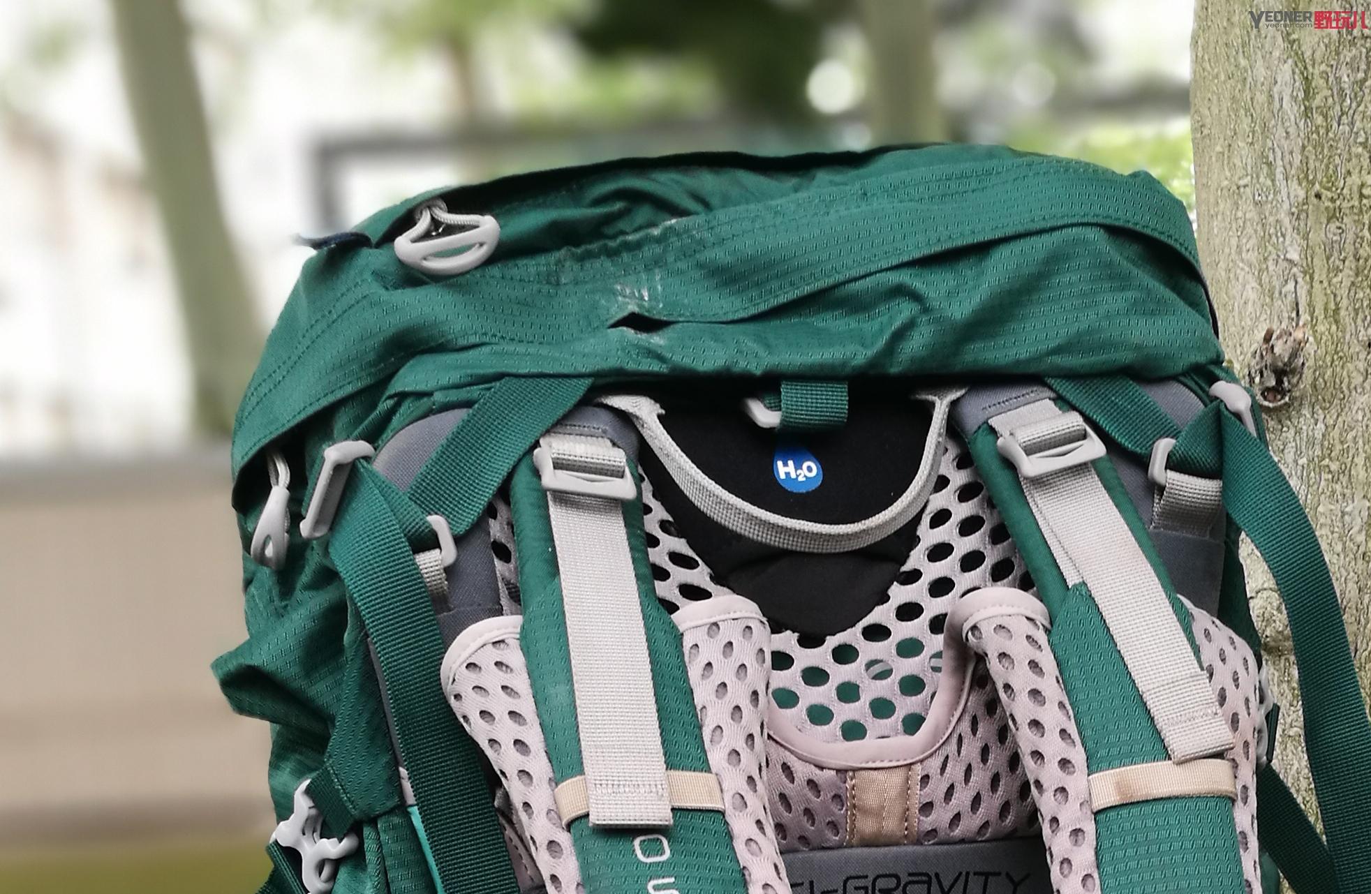 背包有內(nèi)置水袋倉,但是讓筆者費(fèi)解的是Aura AG包的水袋倉出水口設(shè)計在頂部正中央,實際使用不如開在一側(cè)方便。