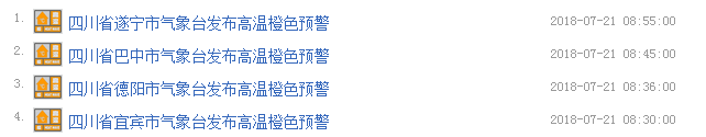 截止中午12點(diǎn),四川遂寧、巴中、德陽(yáng)、宜賓、4市發(fā)布高溫橙色預(yù)警↓