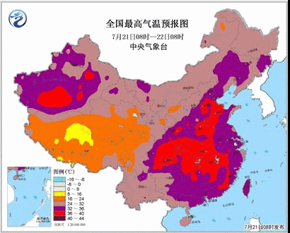 預(yù)計(jì)7月21日白天,陜西南部、華北東南部、內(nèi)蒙古東部偏南地區(qū)、黃淮、江淮、江漢、江南、華南北部和東部、四川東部、貴州東部、重慶、新疆南疆盆地等地高氣溫35~36℃,其中,陜西南部、山東西部、河南北部、安徽南部、湖北、湖南北部、江西北部和西部、四川東部、重慶、新疆南疆盆地等地的部分地區(qū)高氣溫37~39℃,局地可達(dá)40℃。