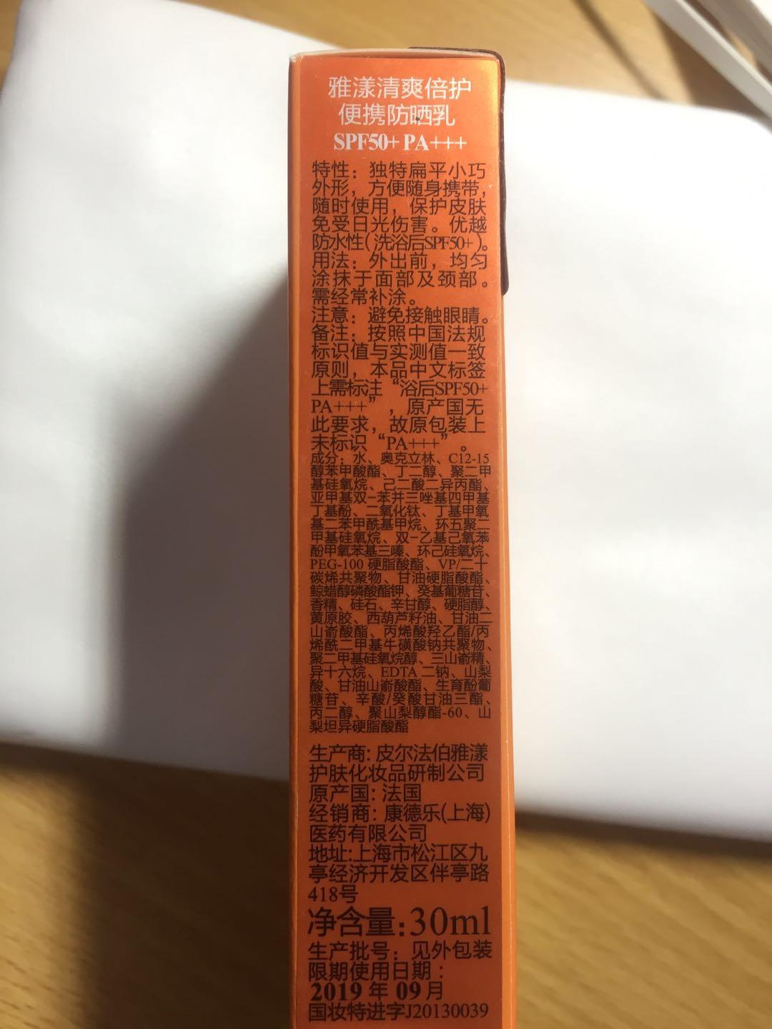雅漾作為一個主打富含溫泉水活性成分、敏感肌痘痘肌專用的歐系品牌,給人的感覺就是很溫和很放心,產(chǎn)品做的良心!高中的時候因為長了很多痘痘,媽媽一直給買的雅漾大噴霧、柔膚水還有他家的潤膚乳,用了之后痘痘消退不少,也沒留痘印,滋潤保濕,味道特別溫柔,對雅漾就一直有著莫名的好感。 這次試用的這款防曬霜據(jù)說有個昵稱“小金剛”,防曬功力可見一斑!包裝正面就是產(chǎn)品圖,直截了當(dāng),產(chǎn)品正面還是一如既往的“家族臉”,一本正經(jīng)的“圈圈”標(biāo)志和防曬應(yīng)有的說明,SPF50+,這個防曬力度可以在整天都外面曬太陽的情況下使用,Broad UVB and UVA protection,可以防護高波段的UVB以及UVA,very water resistant,防水,后面使用可以鑒定一下。 產(chǎn)品背面的話,標(biāo)明了生產(chǎn)日期16年9月,保質(zhì)日期到2019年9月,開封后12個月用完,有了日期的標(biāo)志再也不怕糊自己一臉過期化妝品了!