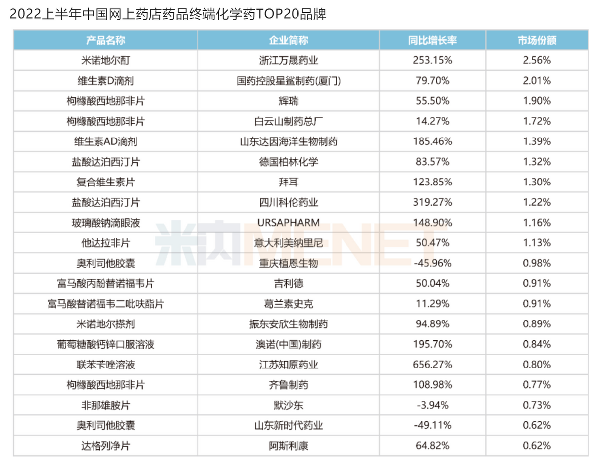 根據(jù)排名信息,2022年上半年蔓迪在網(wǎng)上藥店銷售額同比增長率達到253.15%,單品牌銷售額占據(jù)中國網(wǎng)上藥店終端化學(xué)藥銷售總額的2.56%。