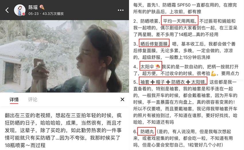 倆星期用14瓶噴霧足以見得陳瑤對防曬有多重視了,而且防曬霜、遮陽傘、帽子套袖、防曬衣太陽鏡也是一應(yīng)俱全,她還嘗試了近風(fēng)比較大的防曬丸,總之就是要做到嚴防死守。而且長時間在外也要注意曬后修復(fù),下邊兒嘉小美也會說到。