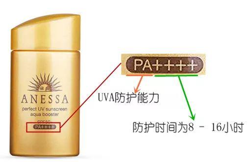 那PA就是針對于UVA的防護果啦,也就是針對曬黑、光老化,那后面的每個“ + “代表防護時間為2– 4小時,依次類推,“ + “越多,抵御UVA 的果就越好,有防護時間也就越長。