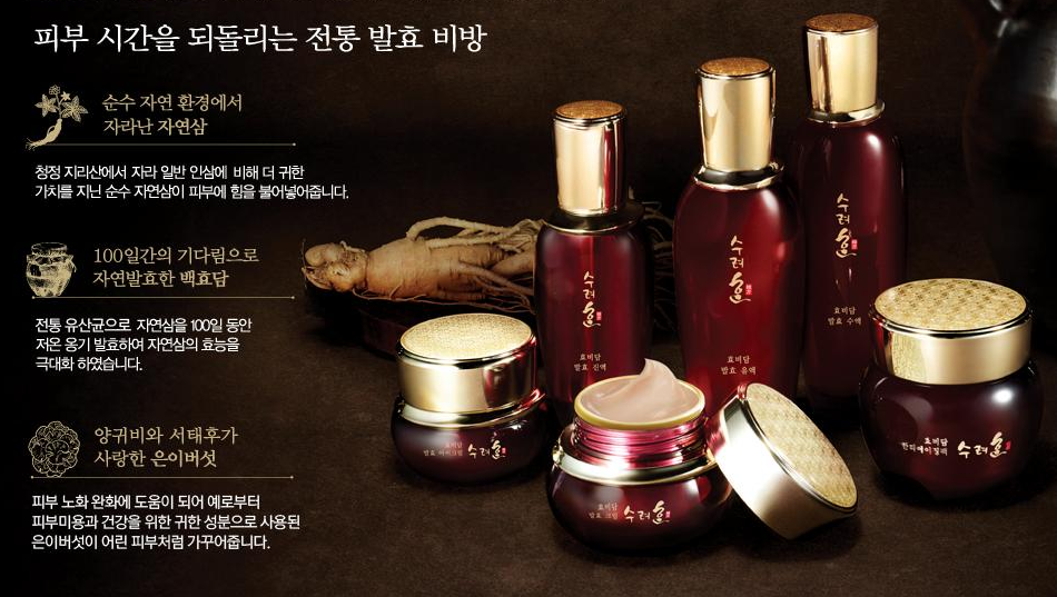 在前幾期的《除WHOO和雪花秀以外,這些韓妝你都認(rèn)識(shí)嗎?》當(dāng)中,袋鼠君也曾為大家介紹過(guò)這款品牌產(chǎn)品。采用傳統(tǒng)的乳酸菌,自然山參經(jīng)過(guò)100日間的低溫容器內(nèi)的發(fā)酵,而達(dá)到自然山參的化的效能,能夠幫助緩解肌膚老化,給皮膚帶來(lái)美容養(yǎng)顏,健康潤(rùn)氣的膚色。