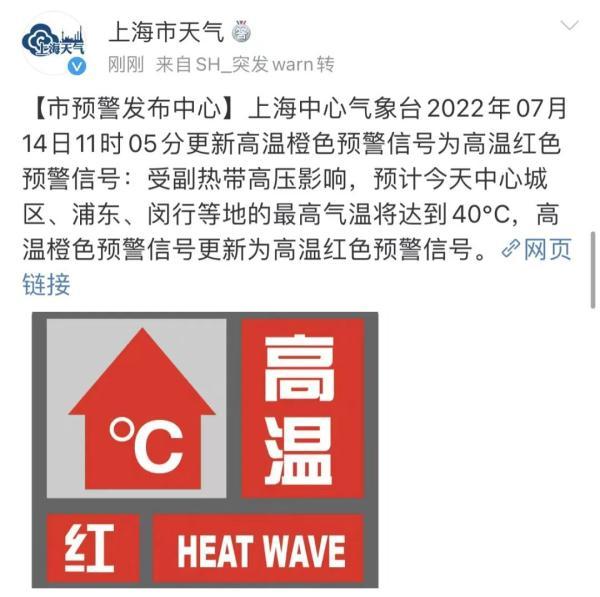 上海中心氣象臺(tái)2022年07月14日11時(shí)05分更新高溫橙色預(yù)警信號(hào)為高溫紅色預(yù)警信號(hào):受副熱帶高壓影響,預(yù)計(jì)今天中心城區(qū)、浦東、閔行等地的高氣溫將達(dá)到40℃。