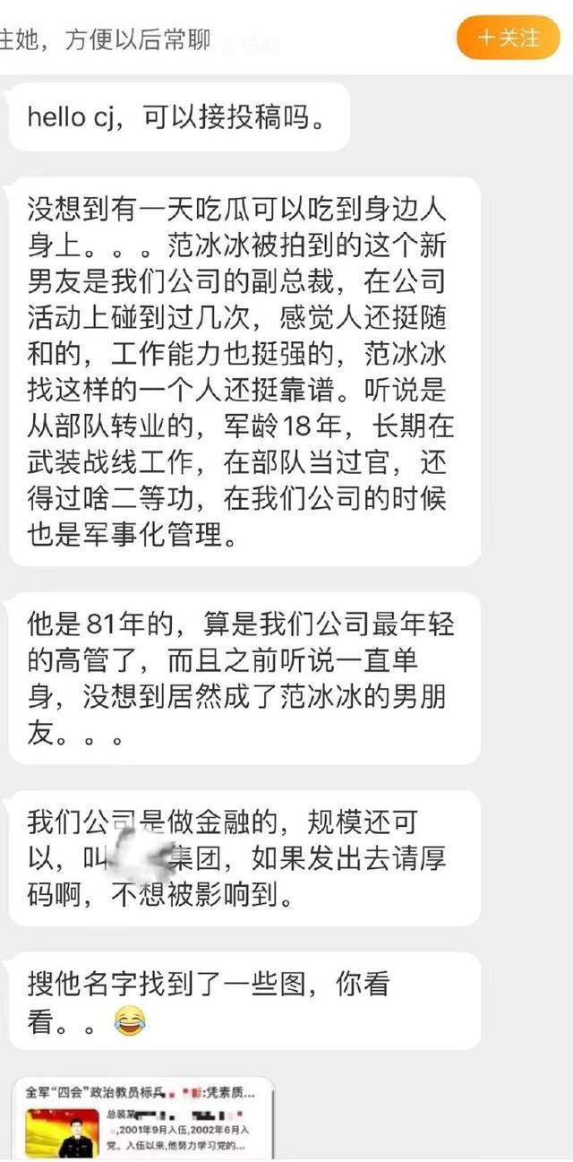 而且還有網(wǎng)友投稿,說(shuō)范冰冰新男友是自己公司的副總裁,人挺靠譜兒,軍齡18年,還榮獲二等功。