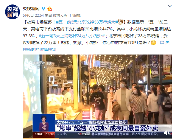 據(jù)新聞報(bào)道,"五一"前3天,北京市民吃掉了33萬串燒烤,上海市民吃掉24萬只小龍蝦,武漢市民吃掉了22萬串燒烤,南京市民每天都要吃掉60噸小龍蝦……所謂"吃貨"改變世界,夜宵市場的復(fù)蘇,讓很多被疫情影響的餐飲商家終于看到了希望。