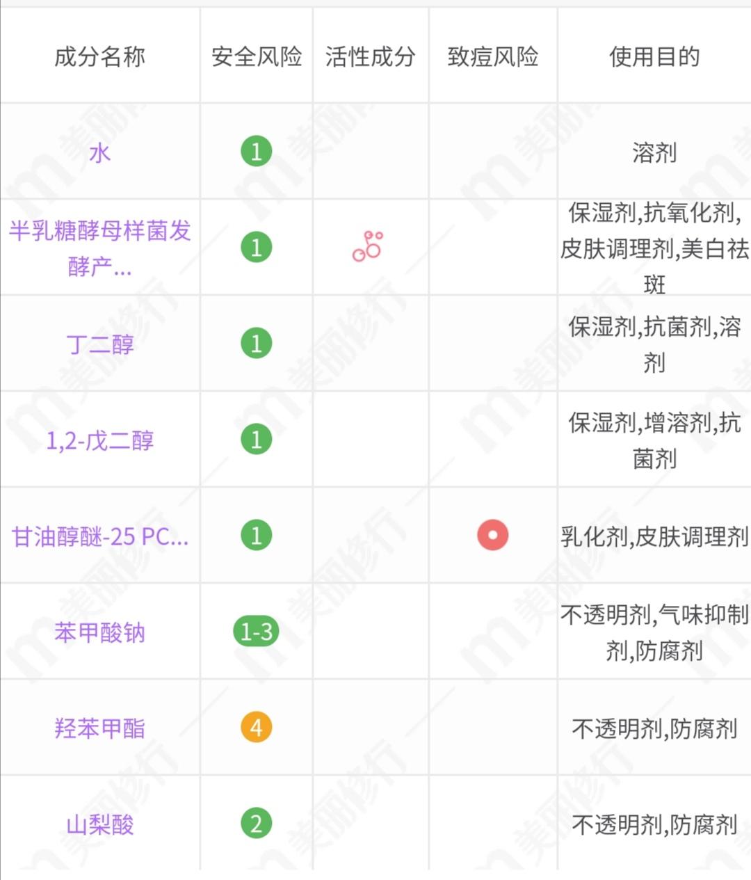 神仙水的成分還是比較簡單的,而且成分種類也少,主要的成分就是半乳糖酵母了,也是他們家的專利成分,還是高濃度的。這個成分的作用就是穩(wěn)定肌膚、讓肌膚更通透,也是神仙水主要的功效成分。而保濕成分有丁二醇和戊二醇,保濕程度還不是很足夠,如果是皮膚比較干的,就需要更保濕的護膚品了。而神仙水的防腐劑就添加了三種,雖然說都是可以保障的,但是如果是敏感肌就需要注意了。