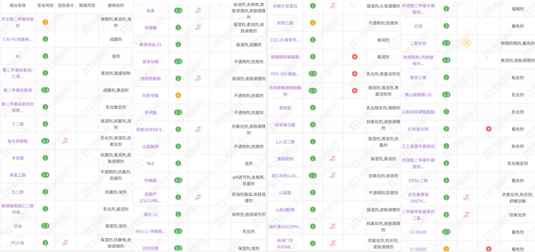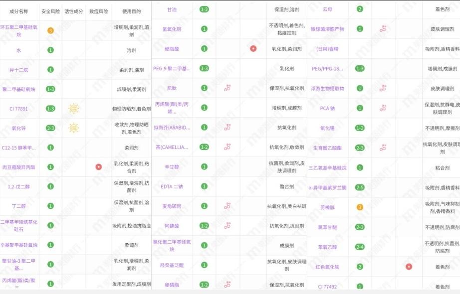 主要的防曬成分是氧化鋅和CI77891,成分很高,主要是物理防曬。雖然是防曬霜,但是也有不少護膚成分,抗氧化劑也有好幾個,是可以有效抗氧化的。