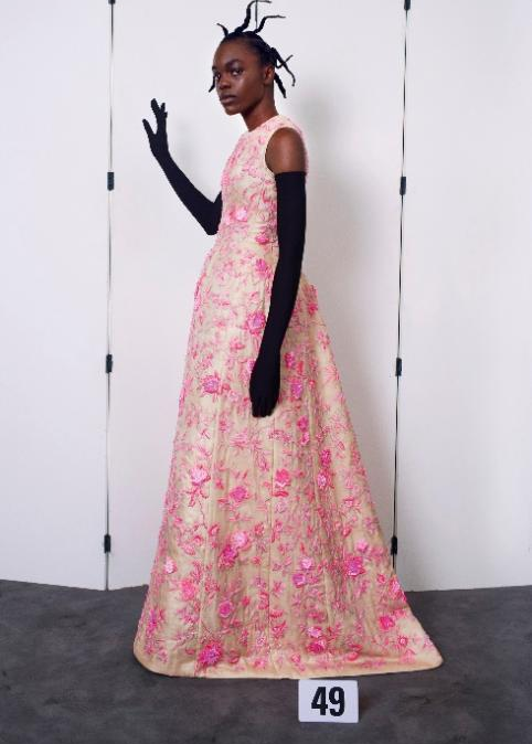 Balenciaga象牙白真絲粉色花卉刺繡造型長禮服