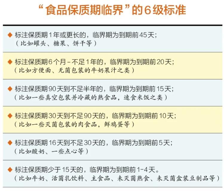 按照北京市工商局公布的“食品保質期臨界”標準,臨期食品一共可以分為6種。