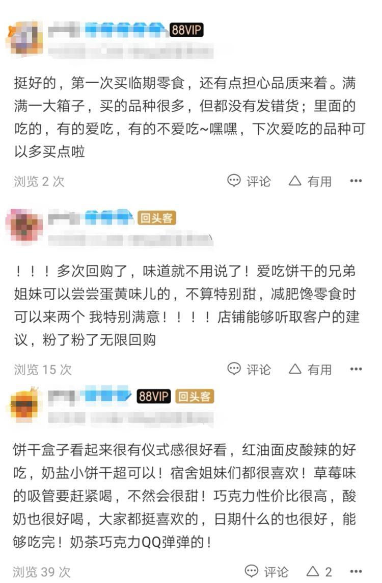 在一家有著152萬粉絲的淘寶臨期食品專營店內,0.29元可以買一包越南進口面包干,16.9元便可買到10袋網(wǎng)紅日式小圓餅。“挺好的,第一次買,滿滿一大箱子。”“多次回購,特別滿意!”商品評價中,不少消費者給出了上述好評。其中,還有不少人的頭像后面緊跟著“回頭客”標識。