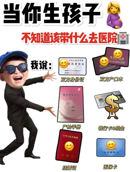 夫妻雙方身份證+社保卡+產(chǎn)檢資料+建檔卡+生育服務(wù)單及其復(fù)印件+現(xiàn)金