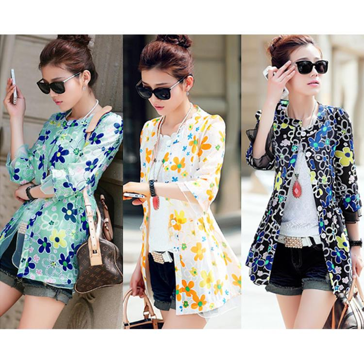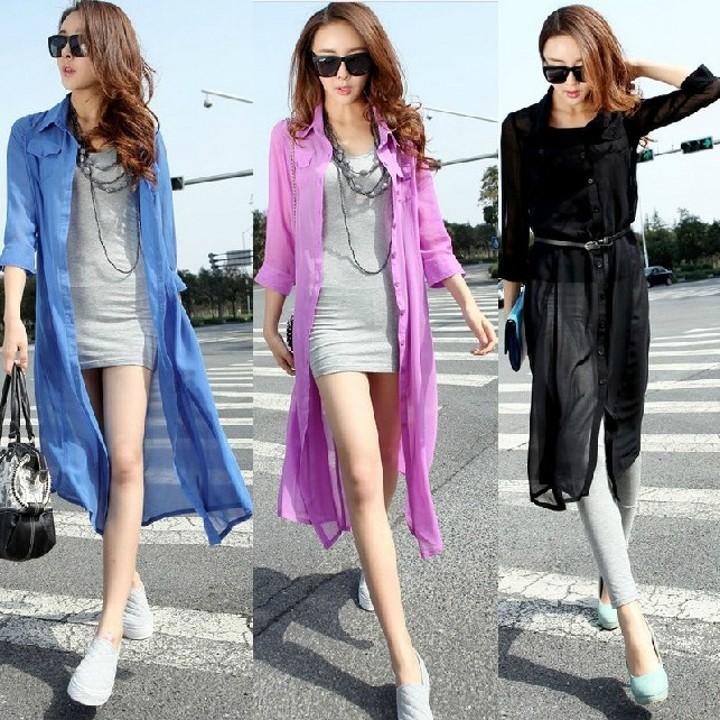 3.2015韓版超長(zhǎng)款襯衫雪紡防曬衣