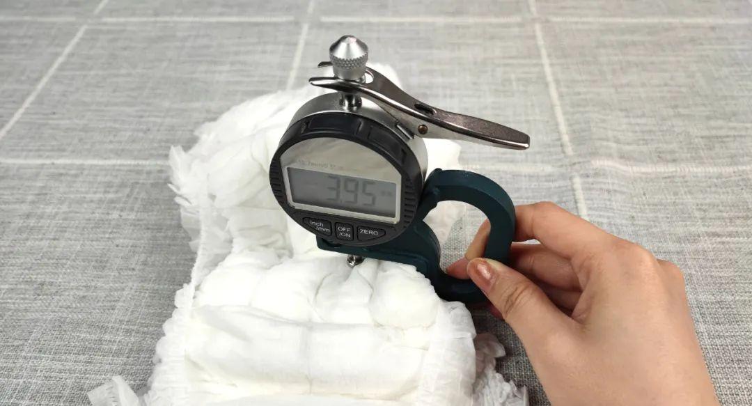 測(cè)試方法:用測(cè)厚規(guī)多次測(cè)量拉拉褲中心部位厚度,取平均值。