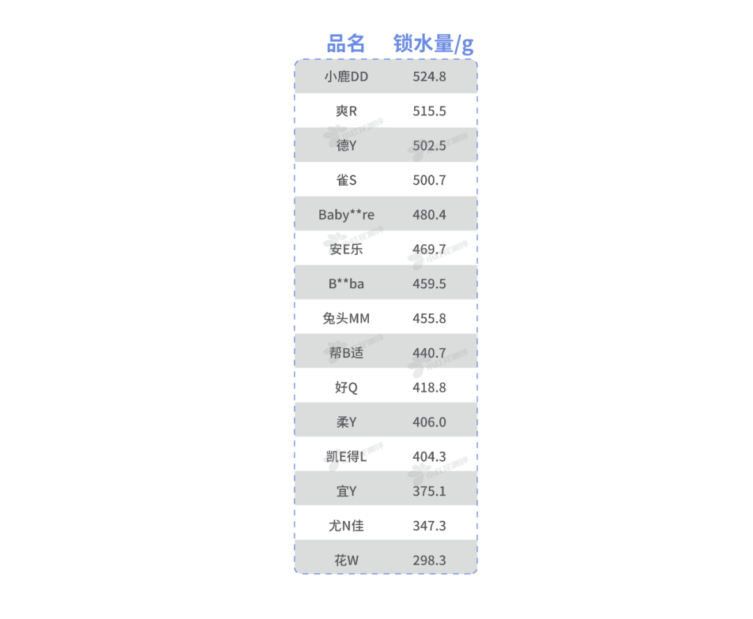 1. 小鹿DD、爽R、德Y、雀S、Baby**re、安E樂、B**ba、兔頭MM,這8款鎖水量都達(dá)到450g以上,不容易因?yàn)槲漳蛞哼^多而漏尿,屬于表現(xiàn)產(chǎn)品。2. 鎖水量小的是花W,為298.3g,不過也能吸收3、4泡尿液(按照80mL一泡尿液計(jì)算)。