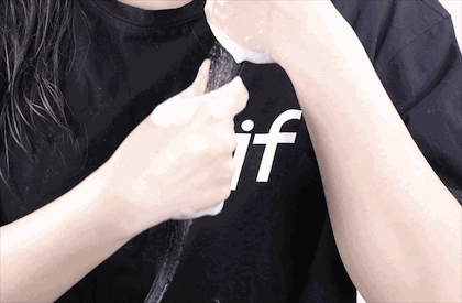 2、充分按摩放松頭皮后,將手指從發(fā)間自上而下捋順,同時(shí)以泡沫按摩發(fā)絲。