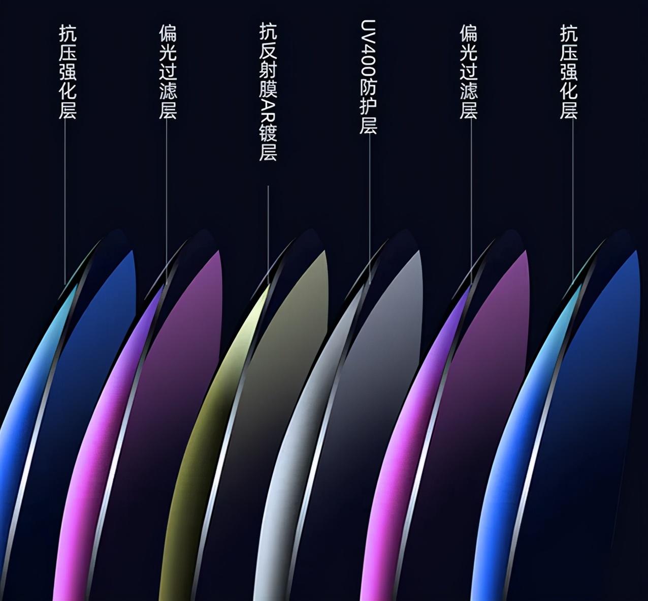 趣看偏光鏡片具有漸進效果,顏色上深下淺,由底部的較淺漸漸過度到較深,可有效過濾日光中99%以上的紫外線,有效保護使用者的眼睛。