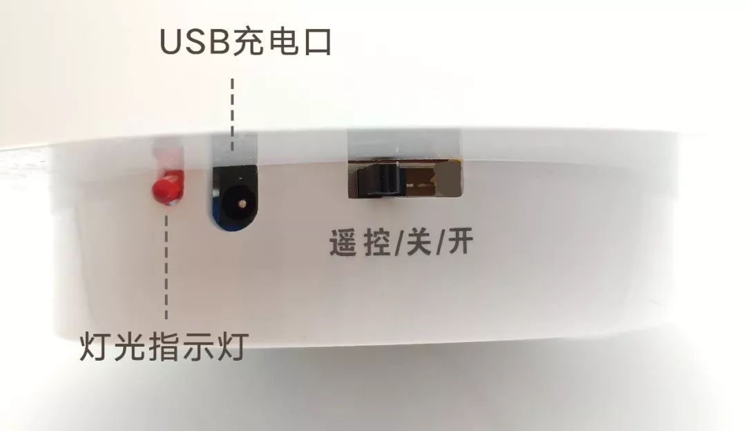 整體操作面板在燈的底部,往左是遙控模式,中間是關閉鍵,往右是長亮鍵。