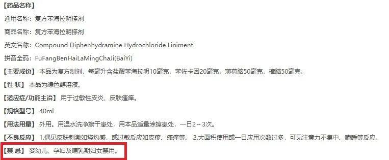 在中國,含有苯海拉明成分的復(fù)方外用搽劑藥品說明書上明確指出,孕婦、哺乳期婦女、嬰幼兒禁止使用。