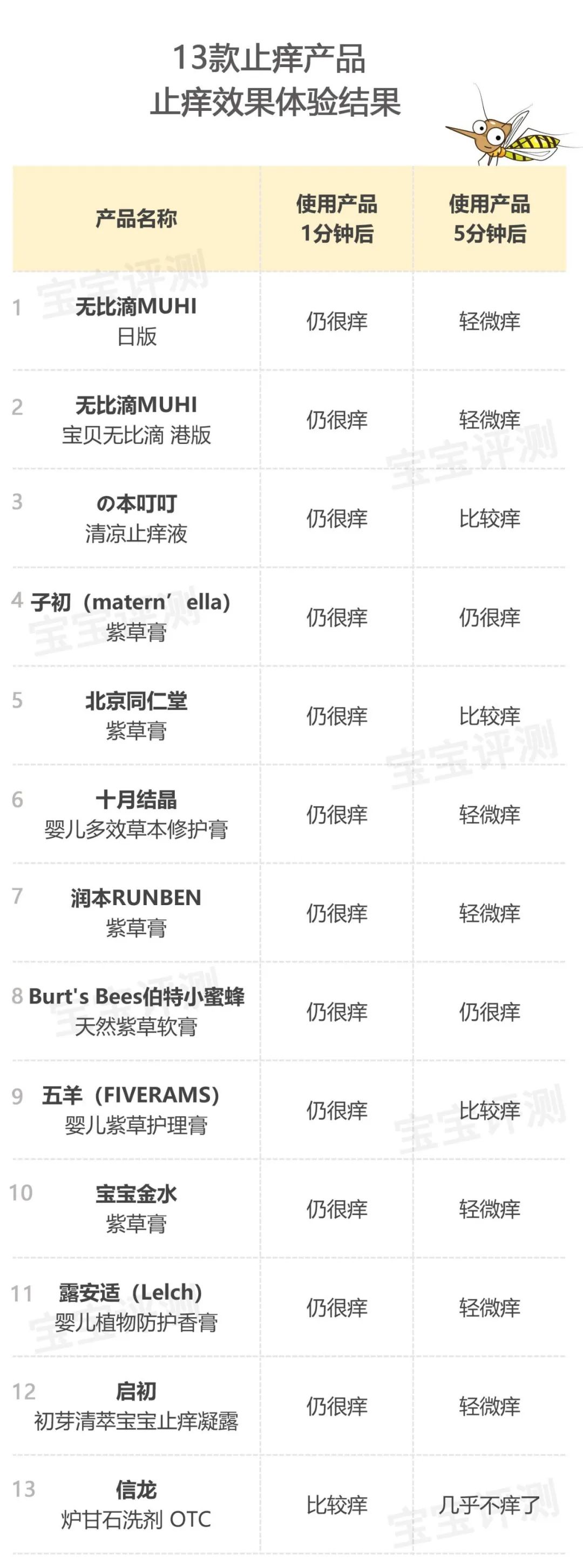 其余10款產(chǎn)品在使用1分鐘后雖然仍感覺很癢,但5分鐘后癢的程度均有所減輕,比如,無比滴日版和港版、十月結(jié)晶、潤本、寶寶金水、露安適、啟初這7款已經(jīng)只是輕微癢了。